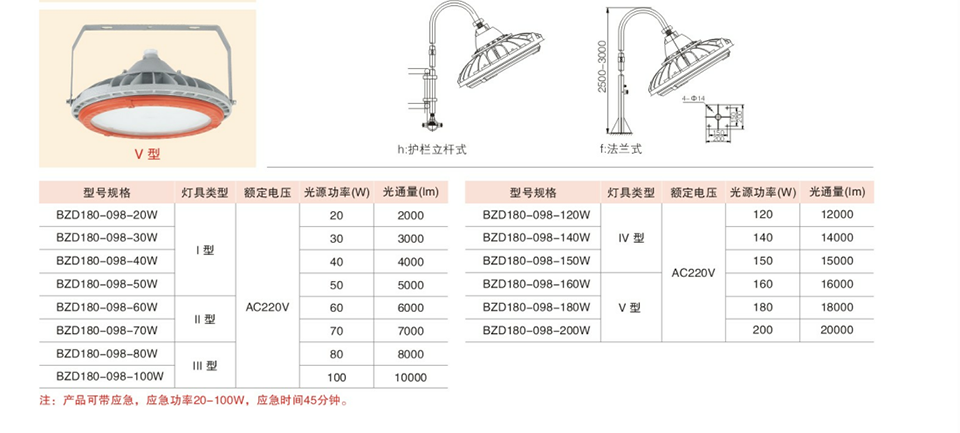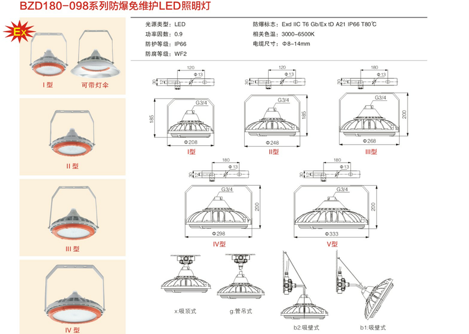 8.安装方式可根据实际现场需要,可选择吸顶式,管吊式、吸壁式、护栏立杆式及法兰式。