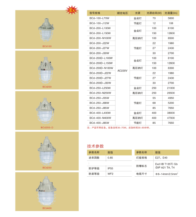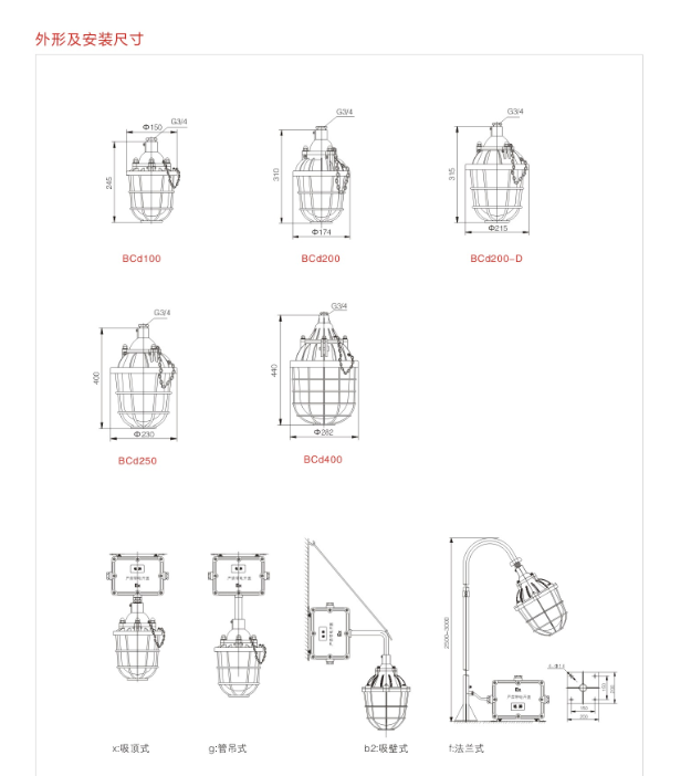 浙江新黎明环保BCd隔爆型防爆灯空壳可以配装的光源:金卤灯、钠灯,自贡灯,LED球形灯,节能灯等等,下面来介绍一下他们配装光源的瓦数和安装尺寸图: